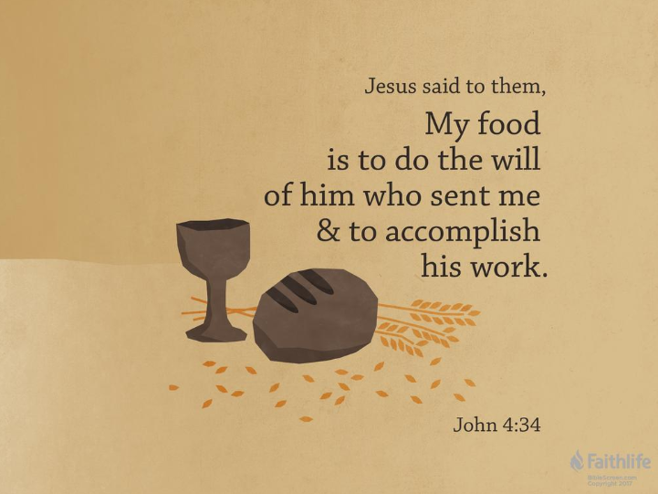(요 4:34) 예수님께서 이들에게 말씀하셨습니다. “나의 음식은 나를 보내신 분의 뜻을 행하고, 그분의 일을 완수하는 것이다.