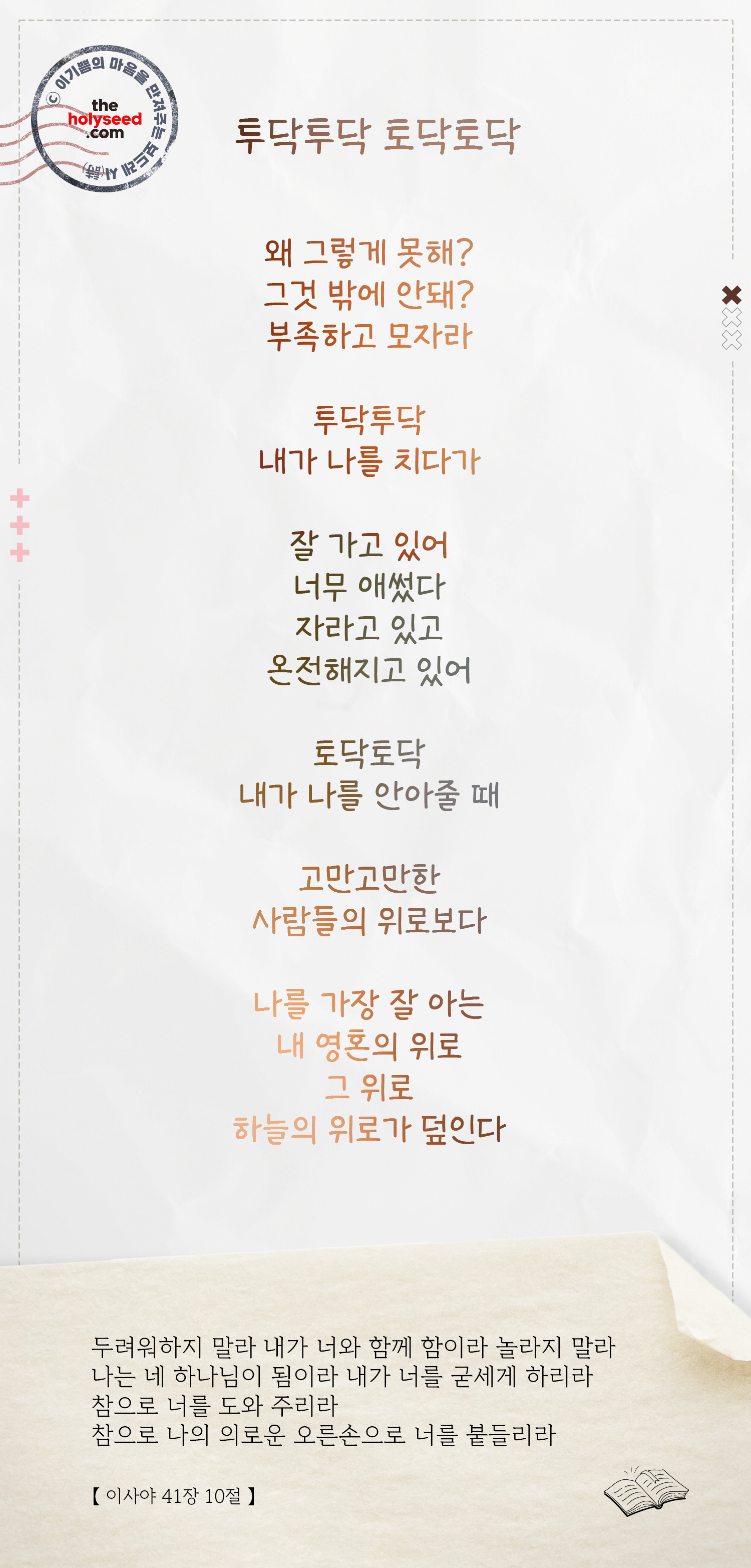 자꾸만 상황과 환경 앞에서 두려워질 때마다 성경에서 말씀하시는 사람의 본분을 기억하겠습니다! 위축되고 근심되고 염려될 때마다 나를 창조하신 하나님께서 부여하신 '다스리는 권세'를 사용하겠습니다! 다른 어떤 것보다도 나 자신의 영혼이 주의 말씀으로 다스림을 받을 수 있도록 나를 주님께 내어놓습니다!